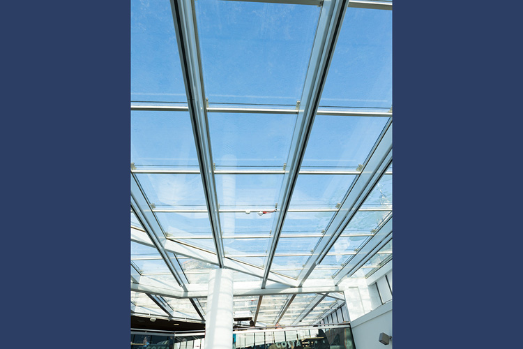 The roof lights are constructed in two layers with the top layer of glass being bolted to a steel structure whilst the inner layer of laminated overhead glazing is held in place with clamp plates with decorative caps.